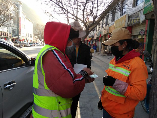 圖為管理人員為環(huán)衛工人解答智能工牌使用方法