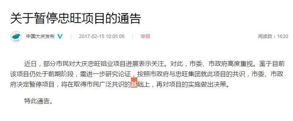 黑龍江大慶市委宣傳部官方微博今日發(fā)布《關(guān)于暫停忠旺項目的通告》稱(chēng),近日,部分市民對大慶忠旺鋁業(yè)項目進(jìn)展表示關(guān)注。對此,市委、市政府高度重視。鑒于目前該項目仍處于前期階段,需進(jìn)一步研究論證,按照市政府與忠旺集團就此項目的共識,市委、市政府決定暫停項目,將在取得市民廣泛共識的基礎上,再對項目的實(shí)施做出決策。